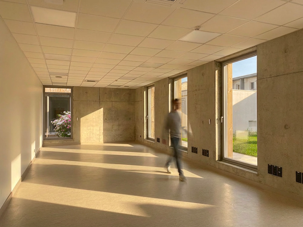 Les choix constructifs du bâtiment de bureaux privilégient la durabilité et la performance énergétique : l’inertie des murs en béton, associée à une isolation thermique extérieure biosourcée et la charpente bois créant un espace tampon en toiture, assurent un confort d’été optimum tout en répondant aux exigences réglementaires environnementales.