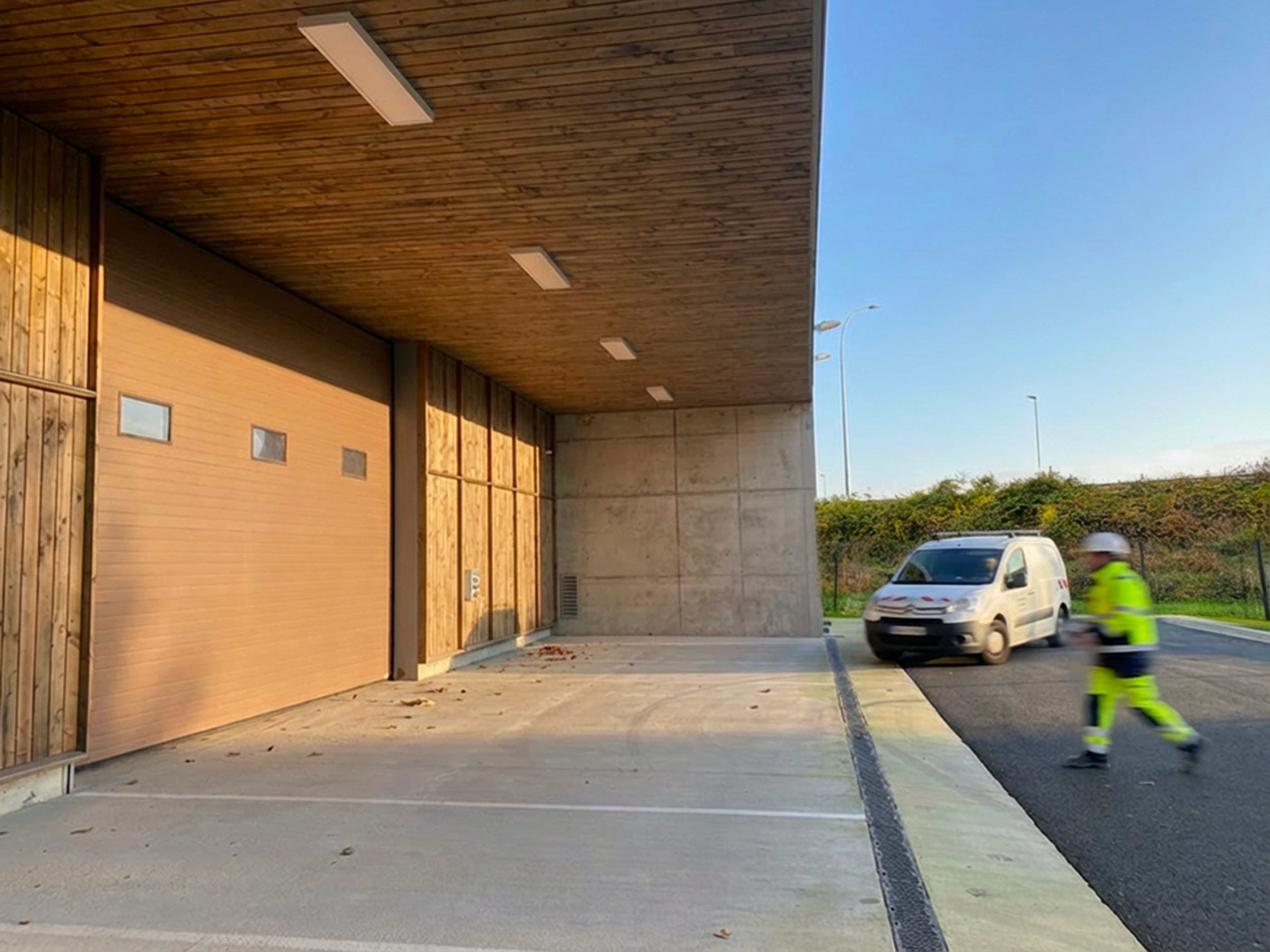 Le bâtiment dédié aux fonctions techniques (atelier, vestiaires, magasin) s’organise autour de deux volumes en béton brut, reliés par une charpente bois abritant le garage et prolongée par un auvent en bois en continuité avec l’écriture architecturale du bâtiment tertiaire. L’expression architecturale, les volumes et les matériaux ont été volontairement adaptés à la vocation plus industrielle de cet ensemble :